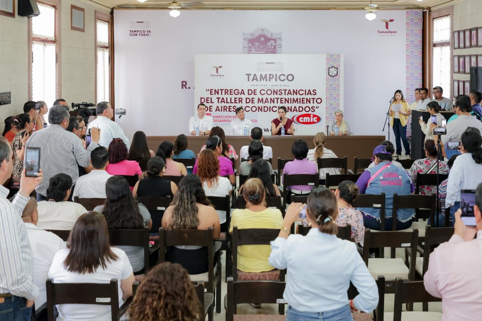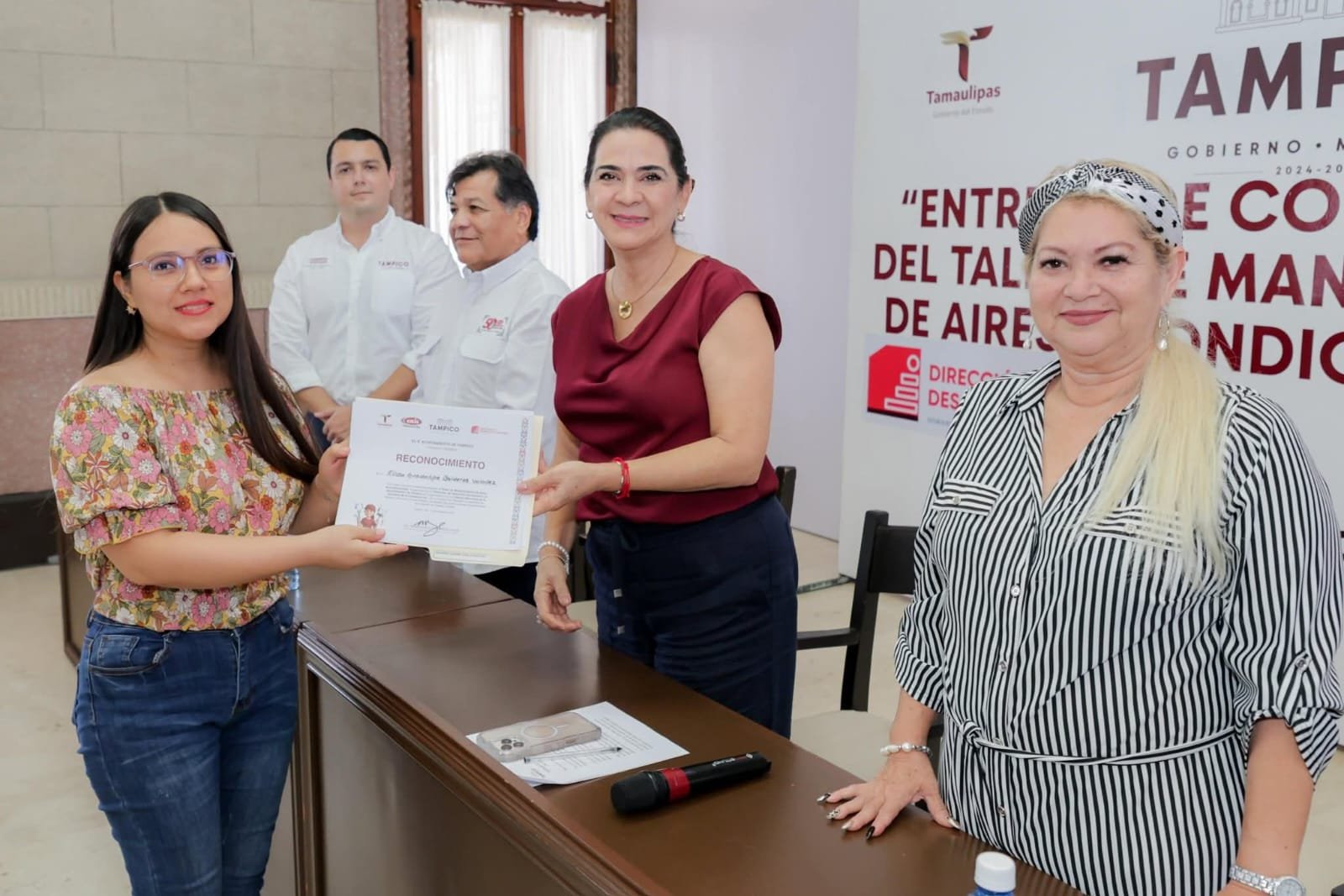 Con el firme compromiso de impulsar el empoderamiento económico de las mujeres y fomentar el autoempleo, la Presidenta Municipal de Tampico, Mónica Villarreal Anaya, encabezó este jueves la ceremonia de clausura y entrega de constancias a las participantes del Segundo Curso-Taller de Mantenimiento de Aires Acondicionados.