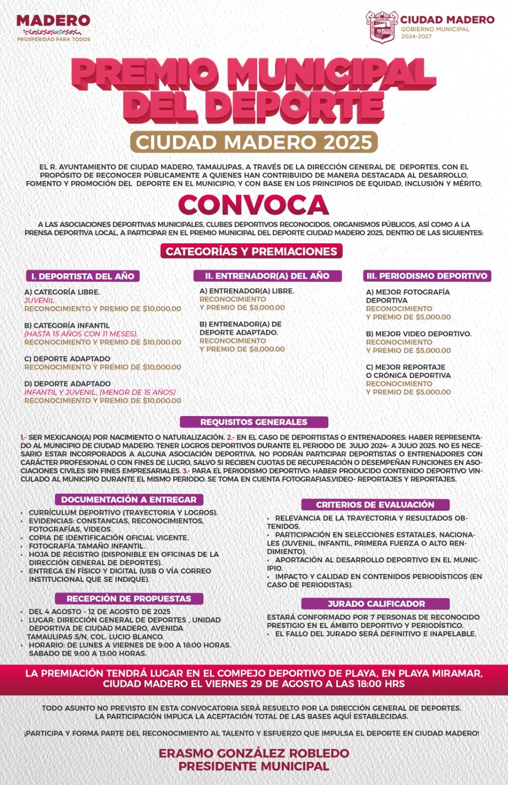 El presidente municipal Erasmo González Robledo, dio a conocer que las bases de esta convocatoria son basadas en los principios de equidad, inclusión y mérito, a los deportistas que han puesto muy en alto al deporte en diversas disciplinas en competencias municipales, regionales, estatales, nacionales y nivel internacional.