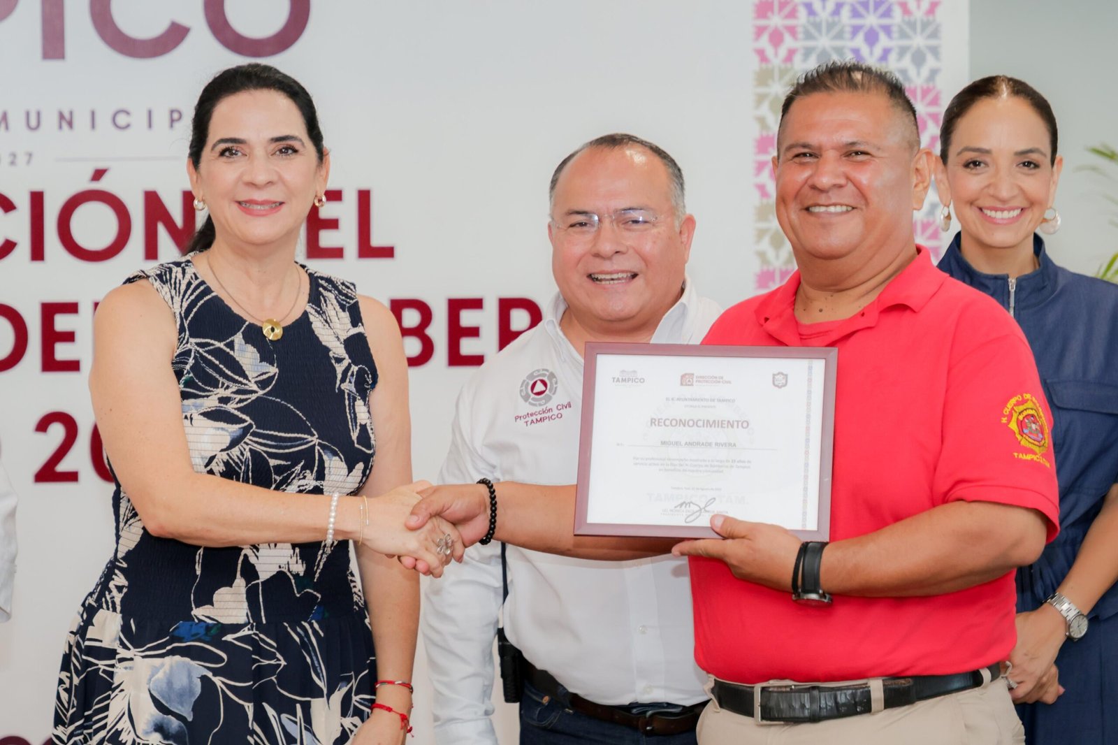 Villarreal Anaya subrayó los esfuerzos de su administración por dignificar al cuerpo, mediante capacitación especializada -incluyendo la capacitación en Mcallen, Texas, y la recepción de más de 2,800 piezas de equipo donadas al municipio que no sólo reforzaron las capacidades a los bomberos de Tampico, sino que también beneficiaron a municipios vecinos como parte de una estrategia regional de fortalecimiento operativo.